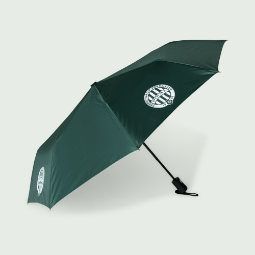 Sötétzöld összecsukható esernyő Ferencvárosi TC címerrel díszítve, gumírozott markolattal, színben hozzáillő tokban. Átmérő: 97 cm