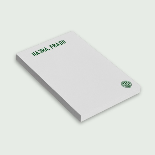 A/5-ös jegyzettömb 80 gr-os papírból "Hajrá Fradi!" felirattal és a Ferencvárosi Torna Club címerével ellátva