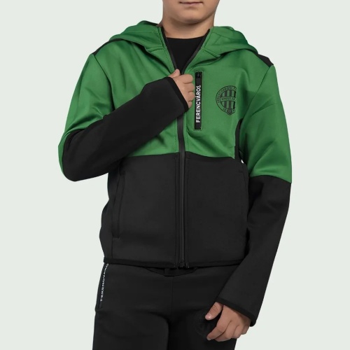 Gyerek zöld-fekete kapucnis pulóver középen teljes hosszában cipzárral, FTC címerrel és zsebének cipzárján "Ferencváros" felirattal díszítve. Anyag: 93% poliészter, 7% elasztán
