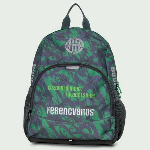 Terepmintás hátizsák párnázott ergonomikus hátrésszel és állítható vállpánttal, egy nagyobb és egy kisebb tárolórésszel, gumis pánttal ellátott tasakkal, valamint mindkét oldalán egy-egy hálós zsebbel. "1899" és "Küzdeni mindig feladni soha!" felirattal, Ferencváros címerrel és hímzett Ferencváros felirattal van díszítve. Magasság: 38 cm, szélesség: 26 cm, mélység: 13 cm.