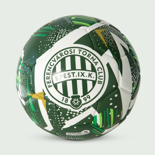 Kiváló minőségű szintetikus anyagból készült futball labda, zöld-fehér színű mintázattal, középen a Ferencvárosi Torna Club címerével díszítve.