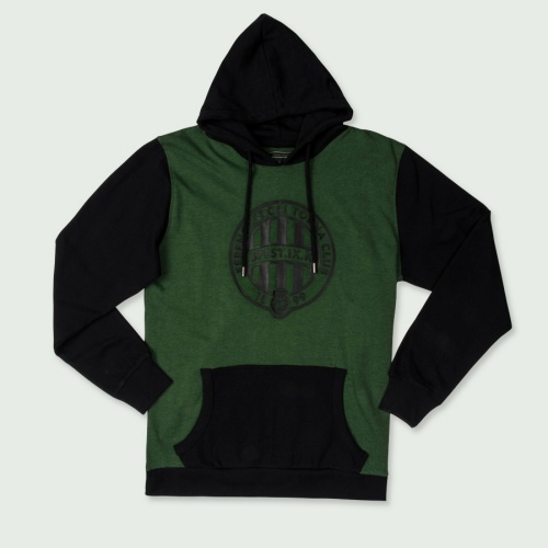 Férfi fekete-zöld pamut kapucnis pulóver puha polár béléssel, középen nagy Fradi címerrel díszítve.