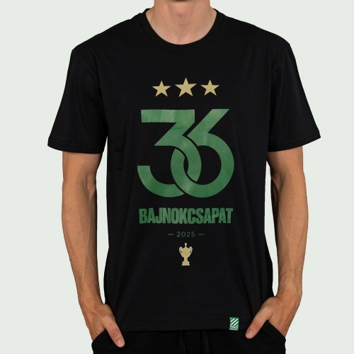 Férfi fekete póló az elején a 36. bajnoki címet szimbolizáló logóval Bajnokcsapat 2025 felirattal és arany kupával díszítve. Hátulján Ferencváros 36. Bajnocsapat 2025 felirattal. Anyag: Pamut
