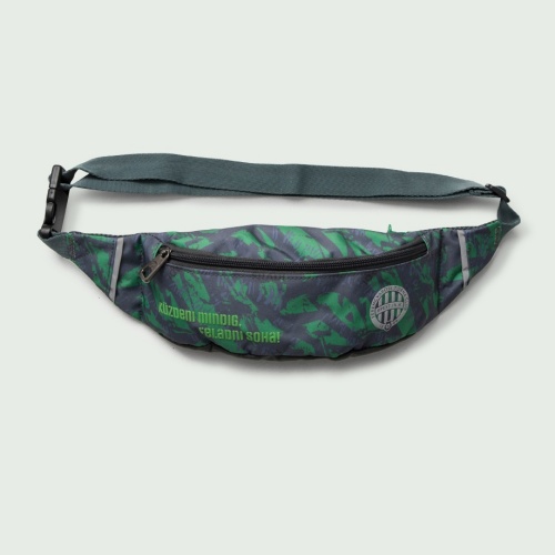 Egyrekeszes, állítható pántos övtáska fényvisszaverő részletekkel, "Küzdeni mindig feladni soha!" felirattal és Ferencváros címerrel díszítve. Méret: 38 cm x 12 cm x 6 cm