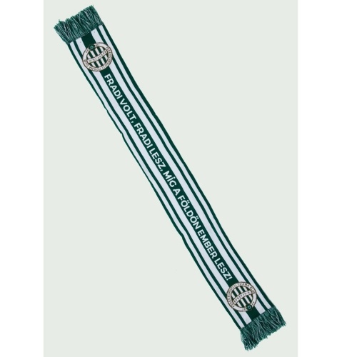 Zöld-fehér csíkos sál "Fradi volt, Fradi lesz, míg a földön ember lesz!" felirattal és két végén FTC címerrel díszítve.