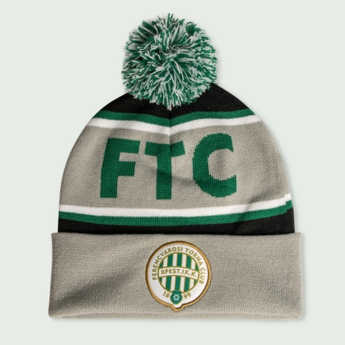 Szürke kötött sapka zöld-fehér bojttal, zöld FTC felirattal és hímzett FTC címerrel díszítve. Anyag:100% poliakril. Egy méretben kapható.