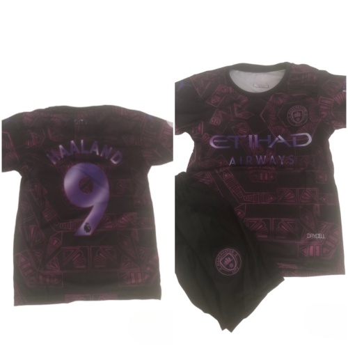 A 2023-24-es Manchester City Haaland 9 feliratú váltó mezgarnitúra. Replika.